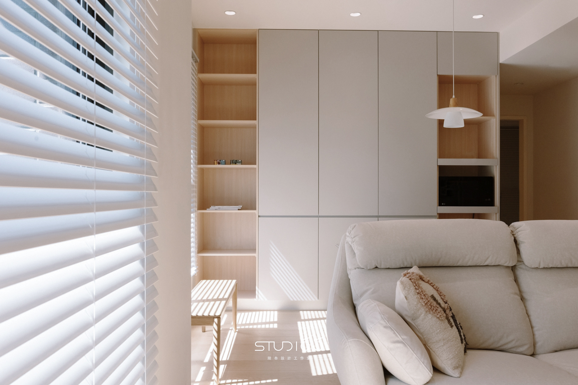 整體調性以溫潤原木色,搭配大面積奶白色油漆,期待陽光賦予空間的表情,有時候一抹陽光灑進來,加上笑鬧聲,已為家裝點了材料,剩餘的變化留給未來。